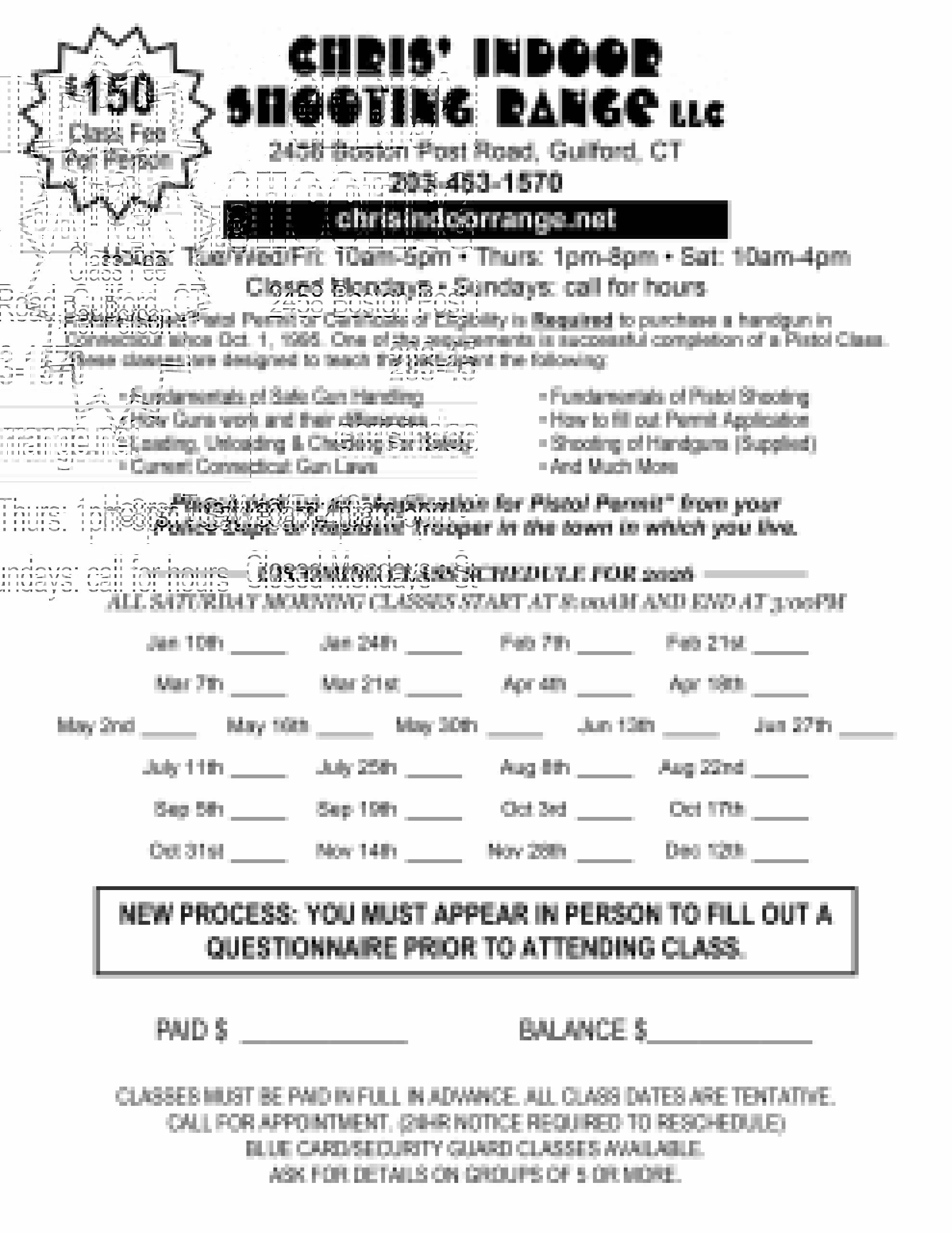 Pistol permit classes must be paid in full in advance. 24-hour prior notice is required to reschedule a class.